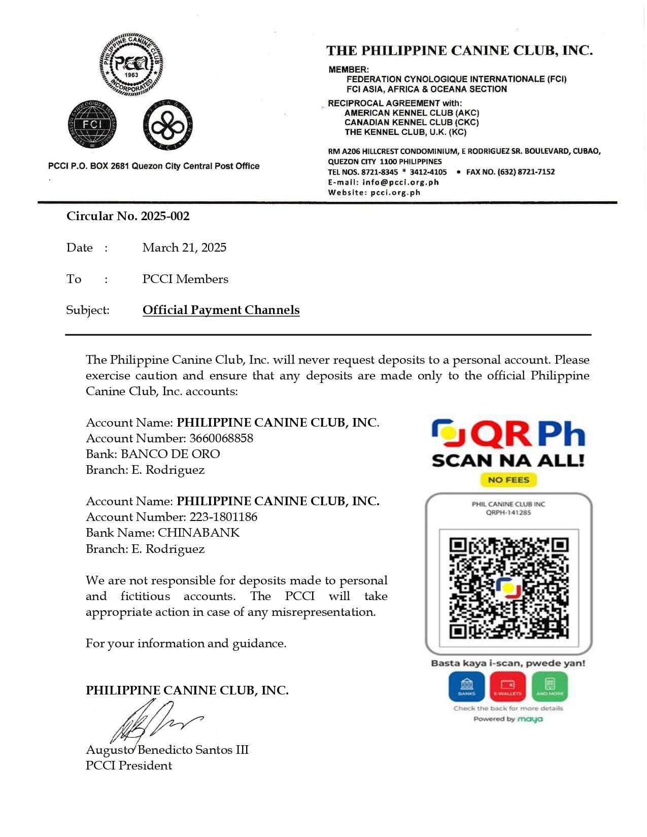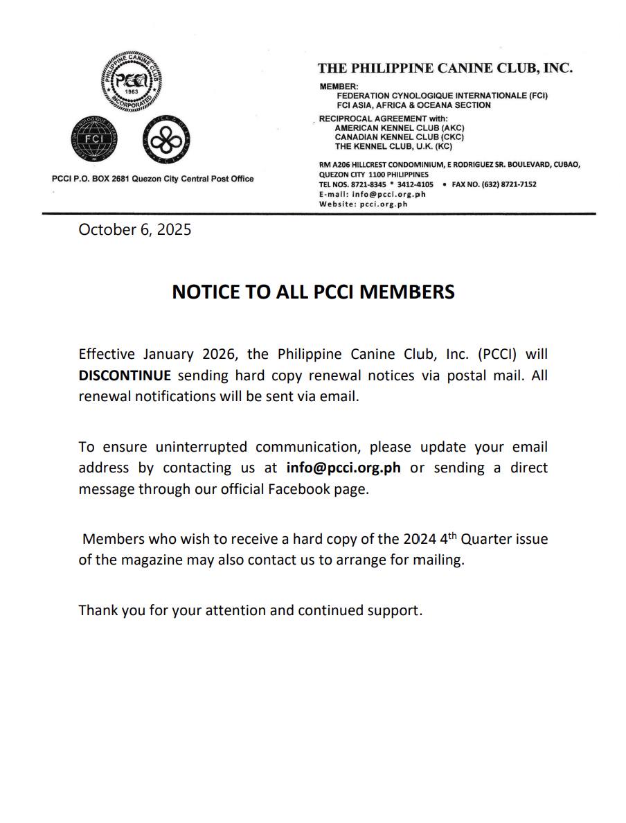 Effective January 1, 2021 PCCI members who will apply for new kennel names, renewal of kennel names and registration of litters will be required that their kennel names must also be registered with the Federation Cynologique Internationale (FCI).